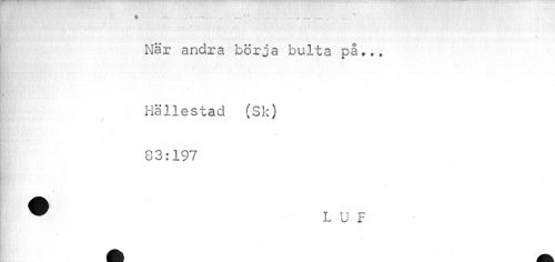 //// ' - ~ ¦. ••• //// - - • //// DU ¦ «• " I //// •v //// i . < V! i. : . . • . '-."V- I ¦ • •¦¦•'. : ' • ' ¦' > //// När andra börja bulta på... //// ¦ //// Hällestad (Sk) //// //// /* //// 83:197 //// j //// jm Kk //// ™ L U F ////