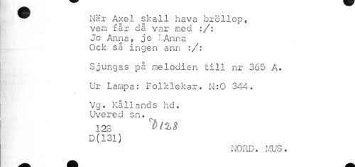//// ^ När Axel skall hava bröllop, //// vem får då var med :/: Jo Anna, jo I-Anna Ock så ingen ann :/: //// Sjungas på melodien till nr 365 A. //// Ur Lampa: Folklekar. N:0 344. //// Vg. Kållands hd. Uvered sn. //// 123 D(131) //// NORD. MUS. ////