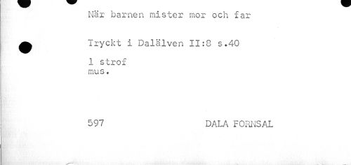 //// När barnen mister mor och far //// ^ Tryckt i Dalälven 11:8 s.40 //// 1 strof //// mus. //// 597 DALA FORNS AL ////
