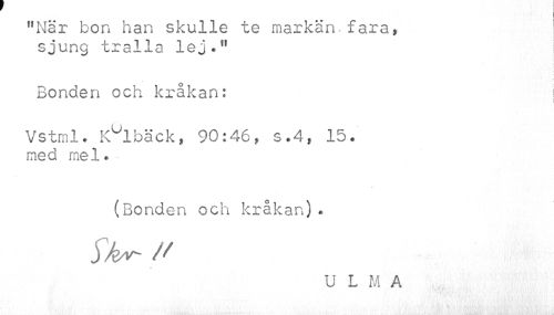 //// "När bon han skulle te markän^fara, sjung tralla lej." //// w //// i //// Bonden och kråkan: //// i //// Vstml. Kulbäck, 90:46, s.4f 15. me d me 1. //// (Bonden och kråkan). //// Sk^ //// //U L M A ////