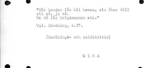 //// "När bonden får bli hemnia, sin åker till //// att så,^ja så. //// Se då får krigsmannen etc." //// Vgl. Ransberg, s.37. //// (Bevärings- och soldatvisor) //// U L M A ////