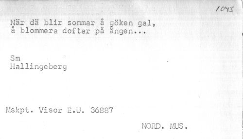 //// ¦ //// ¦ ¦ w • • //// t //// ¦ //// När dä blir sommar å göken gal, å blommera doftar på ängen... //// Sm //// Hallingeberg //// i //// i //// i //// ' i //// ? //// Mskpt. Visor E.U. 36887 //// NORD. MUS. //// i //// j ////