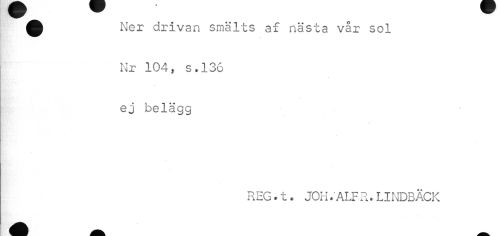 //// mtm ^^ //// £ Ner drivan smälts af nästa vår sol //// Nr 104, s.136 ej belägg //// .i //// REG.t. JOH.ALFR.LINDBÄCK ////