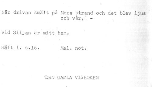 //// När drivan smält på Mora strand och det blev ljus //// och vår, - //// » //// Vid Siljan är mitt hem. //// \ //// Haft 1. s.16. Me1. not. //// . u l //// t //// DEN GAMLA VISBOKEN ////
