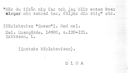 //// "När du ifrån mig far och jag blir ensam kvar xringar min saknad tar, följer din stig" etc. //// (Kärleksvisa "Ensam"). Med mel. //// Dal. Grangärde, 14900, s.120-121. Eriksson, L. //// (Enstaka kärleksvisor). //// 4 //// U L M A //// < ////