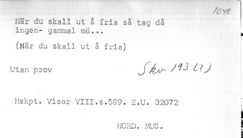 //// /öYtf //// När du skall ut å fria så tag då //// ingen- gammal mö... B //// i i //// (När du skall ut å fria) //// j j //// Utan prov ^J //// i i //// Mskpt. Visor VIII.s.589. E.U. 32072 [ //// NORD. MUS. | ////