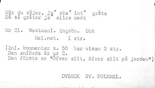 //// I //// När du säjer, j^' ska' in t' gråta Da sa gråter ja allra mest //// Nr 21 * Westmani. Engsön. Dbk //// Mel.not. 1 str. 1 //// (Enl. kommentar s* 50 har visan 2 str. Den anförda är ur 2. //// Den första se "Ofver allt» öfver allt på jorden") //// DYBECK SV. FOLKMEL. ////