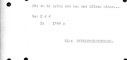 //// w När du är trött och kan med hälsan hinna... //// Se: Z d 4 //// Zz - 1749 a //// KB:s SKILLINGTRYCKSREG. //// " ////