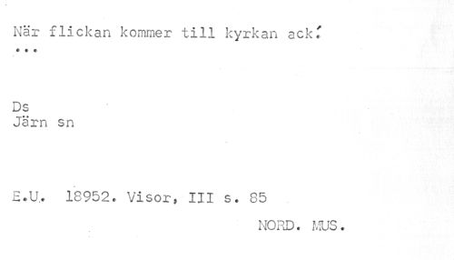 //// När flickan kommer till kyrkan ack' //// * I * //// * //// Ds //// Järn sn //// * //// E.U.. 18952. Visor, III s. 85 //// NORD. MUS. //// f ////