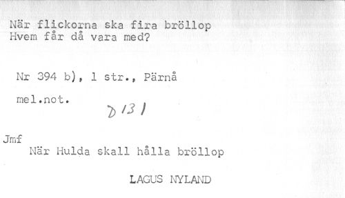 //// ! //// När flickorna ska fira bröllop Hvem får då vara med? //// Nr 394 b), 1 str., Pärnå mel.not. //// 1) >2) //// Jmf //// När Hulda skall hålla bröllop //// ^ //// LAGUS NYLAND ////