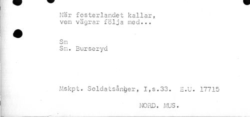 //// nt • //// När fosterlandet kallar, vem vägrar följa med**. //// M Wk //// fl Wm //// Sm //// Sm. Burseryd //// ¦ //// Mskpt. Soldatsån^er, I,s.33. E.U. 17715 //// NORD. MUS. //// i ////