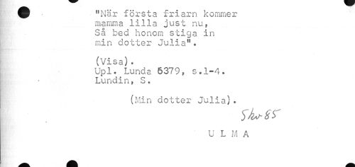 //// ^ "När första friarn kommer //// mamma lilla just nu, Så bed honom stiga in min dotter Julia". //// (Visa). //// Upl. Lunda 6379, s.1-4. //// Lundin, S. //// (Min dotter Julia). //// \ //// I !¦ ' U L M A ////