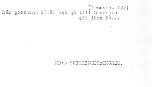 //// (Trossnäs kför) När gossarna ifrån oss gå till Grunnebo //// att lära fa*•• KB:s SKlLLINGTRYCKSREG. ////
