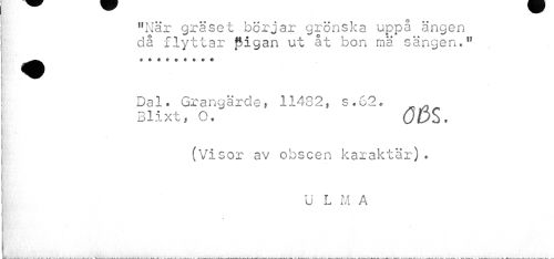 //// "När gräset börjar grönska uppå ängen då flyttar fSigan ut åt bon mä sängen." //// Dal. Grangärde t 11482, s.62* Blixt i O. OV$. //// ¦Bi. m //// (Visor av obscen karaktär). //// U L M A ////