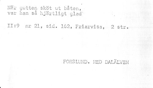//// När gutten sköt ut båten, var han så hjärtligt glacT //// 11:9 nr 21, sid. 162, Friarvisa, 2 str. //// FORSLUND. MED DALÄLVEN ////