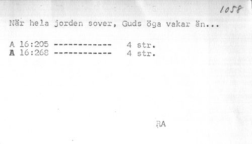 //// (ort //// När hela jorden sover» Guds öga vakar än... //// A 16:205 --- 4 str. //// ä 16:268 ... 4 str. //// RA ////