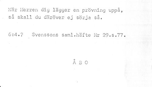//// När Herren dig lägger en prövning uppå, så skall du däröver ej sörja så. //// 6:4.? Svenssons saml.häfte Nr 29.S.77. //// //// /ÅBO //// # ////