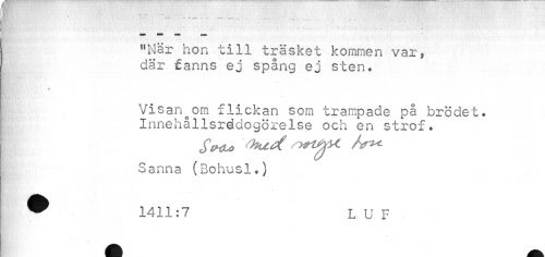 //// K?»;' >' i : ¦: • V» iWwäh / . >¦ ; .'väft < -:\v • • /,..'. ?-V, /< ' i v.'»" <:. "•'•; \ ffi 'arwRM!^ t ' '/») • . : ' ¦ '' •¦ /-*• A:\-7 • //// - - — - — — - • „ _ „ ¦ //// 1 //// "När hon till träsket kommen var, där fanns ej spång ej sten. //// ¦b ^ ; ¦ ^Blll //// Visan^om flickan som trampade på brödet. Innehållsrddogörelse och en strof. //// Si«u rm'Sy* /v™ //// Sanna (Bohusl.) //// H§3v)¦f1 //// ¦ //// _ //// ¦ //// ™ 1411:7 LUF //// j //// . A - //// fl B ^ ////