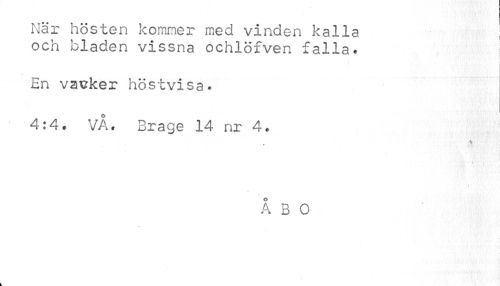 //// När hösten kommer med vinden kalla ; //// och bladen vissna ochlöfven falla. //// i //// En vacker höstvisa. //// 4:4. VÅ. Brage 14 nr 4. //// # //// i i //// ÅBO ////