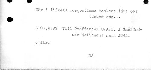 //// När i lifvets morgontimma tankens ljus oss ^^ tänder opp ... //// B 82fs.82 Till Proffessor C.A.H. i Småländska Nationens namn 1842. //// 6 str. //// RA //// . //// ... ^ ___ .. . _____ ____ ___ . ... ____Af ---—-—------^ -Jr 4 - - ////