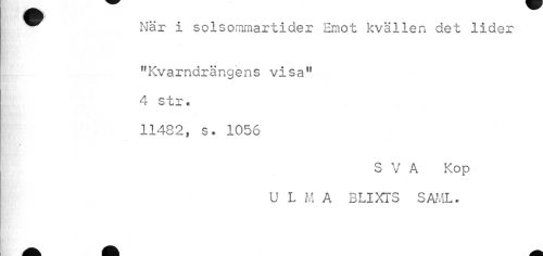 //// När i solsoramartider Emot kvällen det lider //// "Kvarndrängens visa" 4 str. //// 11482, s. 1056 //// S V A Kop U L M A BLIXTS SAML. ////