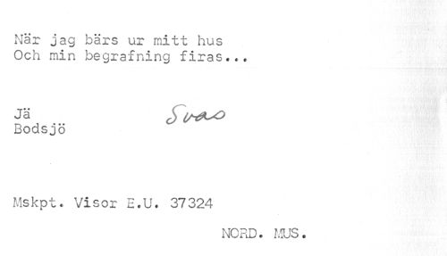 //// 3 vKjy*'iWw^r• ''i •' J //// När jag bärs ur mitt hus //// Och min begrafning firas... //// . //// Jä J //// Bodsjö //// Mskpt. Visor E.U. 37324 //// NORD. MUS. ////