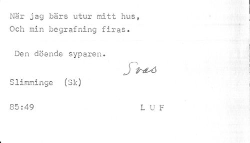 //// När jag bärs utur mitt hus, //// i, i //// Och min begrafning firas. //// i //// I //// i ! //// Den döende syparen. Slimminge (Sk) | //// s i //// 85:49 LUF //// i i //// I ////