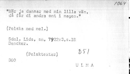 //// / r //// f //// "När ja dansar med min lilla vän, då får di andra ont i magen." a //// (Polska med mel.) //// i //// Sdml. Lids» sn, 7922:3,s.18 Dencker. //// i //// b^l //// (Polsktexter} //// 360 j //// U L M A - } //// g ////