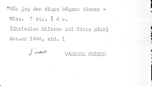 //// "När jag den diupa bägarn tömmer -Wisa. 7 str. a 4 v. //// (Christian Nilsson uti Stora Bäck) \ //// i //// Acc.nr 1444, sid. 1 ! //// VARBERG MUSEUM ' //// ¦ //// • v ////