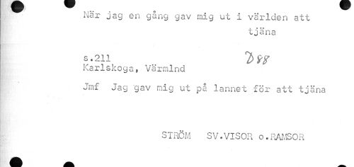//// När jag en gång gav mig ut i världen att //// tjäna //// s .211 //// Karlskoga, Värmlnd //// Jmf Jag gav mig ut på lannet för att tjäna //// STRÖM SV.VISOR o.RAMSOR ////