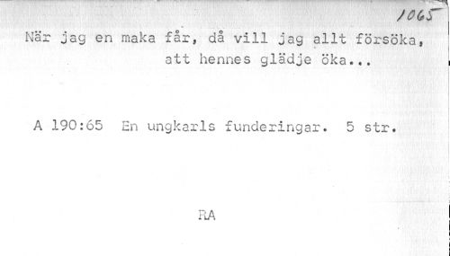 //// När jag en maka får, då vill jag allt försöka, //// att hennes glädje öka... 1 //// A 190:65 En ungkarls funderingar. 5 str. //// v //// 1 i //// . r } //// : //// t //// RA //// c ¦ //// I //// I ¦ //// C i //// i ¦ //// ¦ ////
