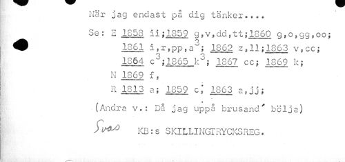 //// När jag endast på dig tänker...» //// Se: E 1358 ii i 1352 9»v»dd,tt;1860 g,o,gg,oo; ^ 1361 i,r»pp,a°; 1862 z.Il 11863 v,cc; //// 1364 c3; 1865 k3; 1867 ccj 1869 lc; N 1869 f, //// R 1813 a; 1359 c»' 1863 a, j j » //// * //// (Andra v.: Då jag uppå brusand' bölja) //// ) KB: s SKILLINGTRYCKSREG. ////