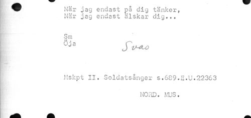 //// ^P När jag endast på dig tänker, //// När jag endast älskar dig... //// Sm //// Mskpt II. Soldatsånger s.689.E.U.22363 //// NORD. MUS. ////