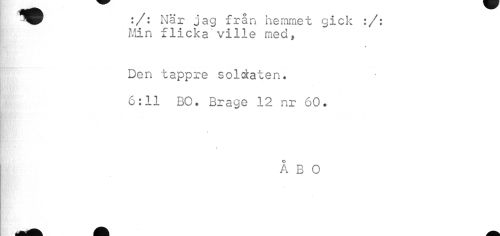 //// :/: När jag från hemmet gick :/: Min flicka ville med, //// Den tappre soldaten. 6:11 BO. Brage 12 nr 60. //// 4 //// ÅBO //// , //// . M Bb " ////