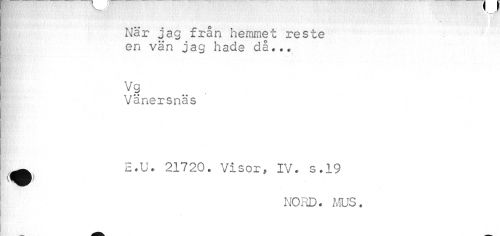 //// När jag från hemmet reste en vän jag hade då... //// Vg //// Vänersnäs //// __E.U. 21720. Visor, IV. s.19 //// (fl» //// NORD. MUS. ////