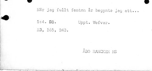 //// När jag fullt femton år begynte jag att... //// 5:4. DB. Uppt. Wefvar. //// R3, 165, 243. //// ÅBO RANCKEN MS //// t ////