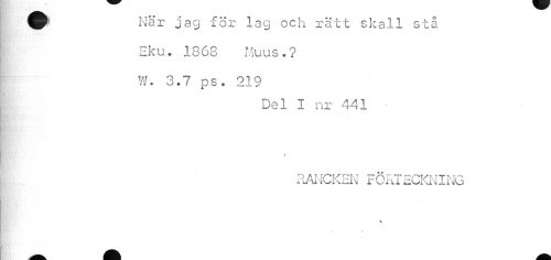 //// ÉV När jag för lag och rätt skall sta //// ¦ //// Hr Sfr //// Eku. 1868 Muus.? W. 3.7 ps. 219 //// Del I nr 441 • //// RANCKEN FÖRTECKNING //// //// /^^^^^ _ ////