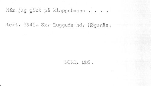 //// När jag gick pa klappebanan . ? . . I //// Lekt. 1941. Sk. Luggude hd. Höganäs. //// i //// NORD. MUS. ////