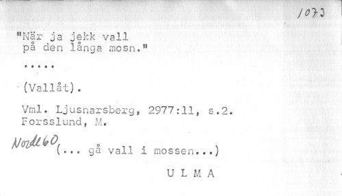 //// / w //// " 'l //// "När ja jekk vall | //// på den långa mosn." //// * • # * t //// • (Vallåt) . //// Vrnl* Ljusnarsberg, 2977:11f s*2. Forsslund, M. //// val! //// V //// U L M A ////