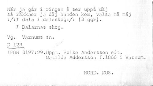 //// I //// När ja går i ringen å ser uppå däj så räkkaer ja däj handen kom, valsa mä mäj :/:I dala i dalaskog:/: (3 ggr}* //// I Dalarnas skog. //// Vg. Varnums sn. D 123 v //// IFGH 3197:29.Uppt. Folke Andersson eft. //// Matilda Addersson f.1866 i Varnum. | //// t i ! ! //// NORD. MUS. //// T //// J ////
