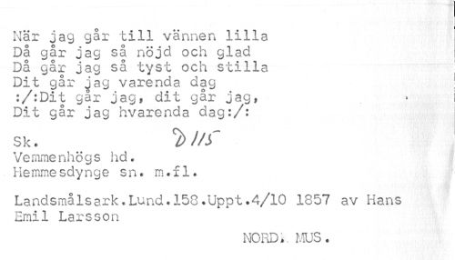 //// Här jag går till vännen lilla Då går jag så nöjd och glad Då går jag så tyst och stilla //// Dit går jag varenda dag ' //// :/:Dit gar jag, dit går jag, » j //// Dit går jag hvarenda dag:/: //// Sk. />//f //// Vemmenhögs hd. Hemmesdynge sn. m.fl. //// Landsmålsark.Lund.158.Uppt.4/10 1857 av Hans Emil Larsson //// NORD i. MUS. ////