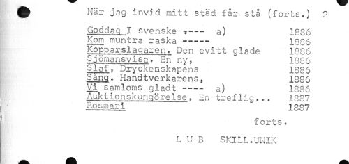 //// ^ När jag invid mitt städ får stå (forts.) 2 //// Goddag I svenske t--- a) 1836 //// Kom muntra raska-----1836 //// Kopparslagaren. Den evitt glade 1886 //// Sjömansvisa» En ny, 1886 //// S1af» Dryckeaskapens 1886 //// Sång. Handtverkarens, 1886 //// Vi samloms gladt ---- a) 1886 //// Auktionskungörelse » En treflig... 1887 //// Rosmari 1887 //// forts. L U B SiaLL.UNIK ////