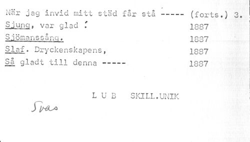 //// När jag invid mitt städ får stå ----- (forts.) 3. Sjung> var glad f 1887 //// Sjömanssång» 1837 //// SJLaf. Dryckenskapens, 1887 //// Så gladt till denna ----- 1887 //// i //// ! //// i //// i I I //// t | //// | //// L U B SKILL.UNIK i //// J ItfL* ////
