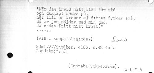 //// "När jag invid mitt städ får stå och duktigt hamra på, //// när till en kraber ej fattas fyrkar små, då är jag nöjder med min dag* då andas fritt mitt bröstf" //// (Visa* Kopparslagaren.) S i/^^ //// //// /Sdml•V*Vingåker, 4165, s.48 fol. ^ Lundström, J. //// (Enstaka yrkesvisor). //// ' ' ULM ////