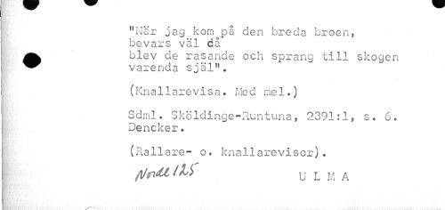 //// "När jag kom på den breda broen, bevars väl då //// •blev de rasande och sprang till skogen varenda själ11. //// (Knallarevisa. Med mel.) //// Sdml. Sköldinge-Runtuna* 2391:1, s. 6. Dencker. //// (Rallare- o. knallarevisor). flJtvU- (M u L M A //// . ////