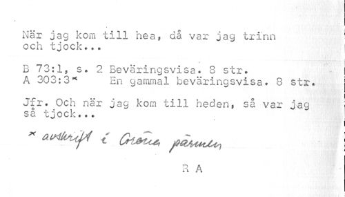 //// % //// • . När jag kom till hea, då var jag trinn 1 //// och tjock... //// i //// f i H'fmH //// B 73:1, s. 2 Beväringsvisa. 8 str. A 303:3* En gammal beväringsvisa. 8 str. //// Jfr. Och när jag kom till heden, så var jag i sa tjock... //// i //// * artt^ t Gi^c* piMHJ^ J //// R A //// i ////