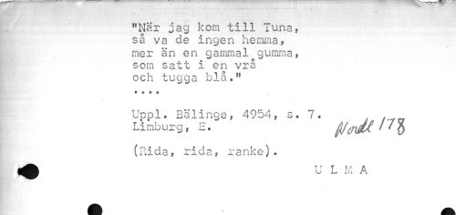 //// "När jag kom till Tuna, så va de ingen hemma, mer än en gammal gumma, som satt i en vrå och tugga blå." t t § • //// Uppl. Bälinge, 4954, s. 7. , //// Limbur g, E. ^mM ''Q //// (Rida, rida, ranke). //// A^flÉk T T T T\f- A //// f^B u L M A ////