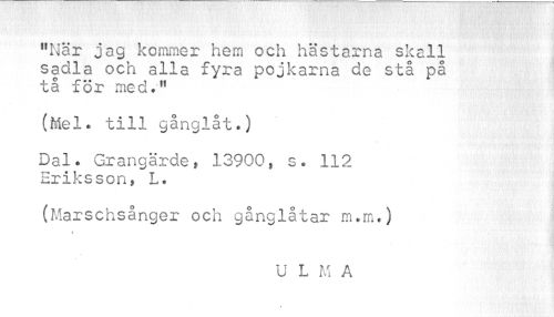 //// "När jag kommer hem och hästarna skall sadla och alla fyra pojkarna de stå på tå för med." //// (Mel. till gånglåt.) //// Dal * Grangärde , 13900, s. 112 Eriksson, L. //// (Marschsånger och gånglåtar rrum.) //// > //// U L M A ////