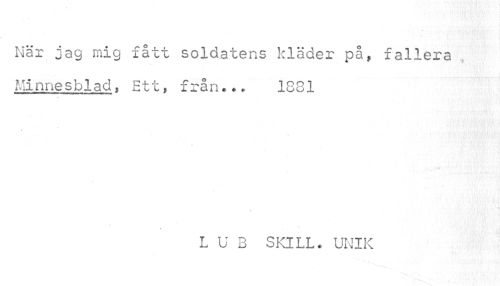 //// När jag mig fått soldatens kläder på, fallera Minnesblad, Ett, från... 1881 //// L U B SKILL. UNIK ////