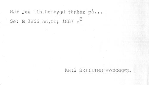 //// När jag min,hembygd tänker på... //// Se: E 1866 nn,rr; 1867 e3 //// * //// 4 //// $ //// KB:S SKILLIN6TRYCKSREG. ////